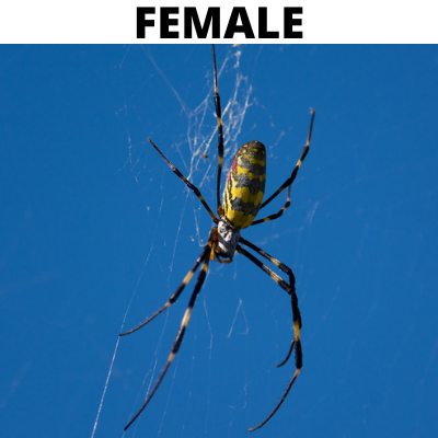 Joro Spiders are usually first identified by their large size and bright yellow markings. Female Joro Spiders are larger than males, and can have a leg span of up to 3 or 4 inches. The top of the abdomen of a female Joro will be bright yellow with grey-blue bands. The bottom will have a large red mark surrounded by yellow line patterns, and the legs are black with thick yellow bands.